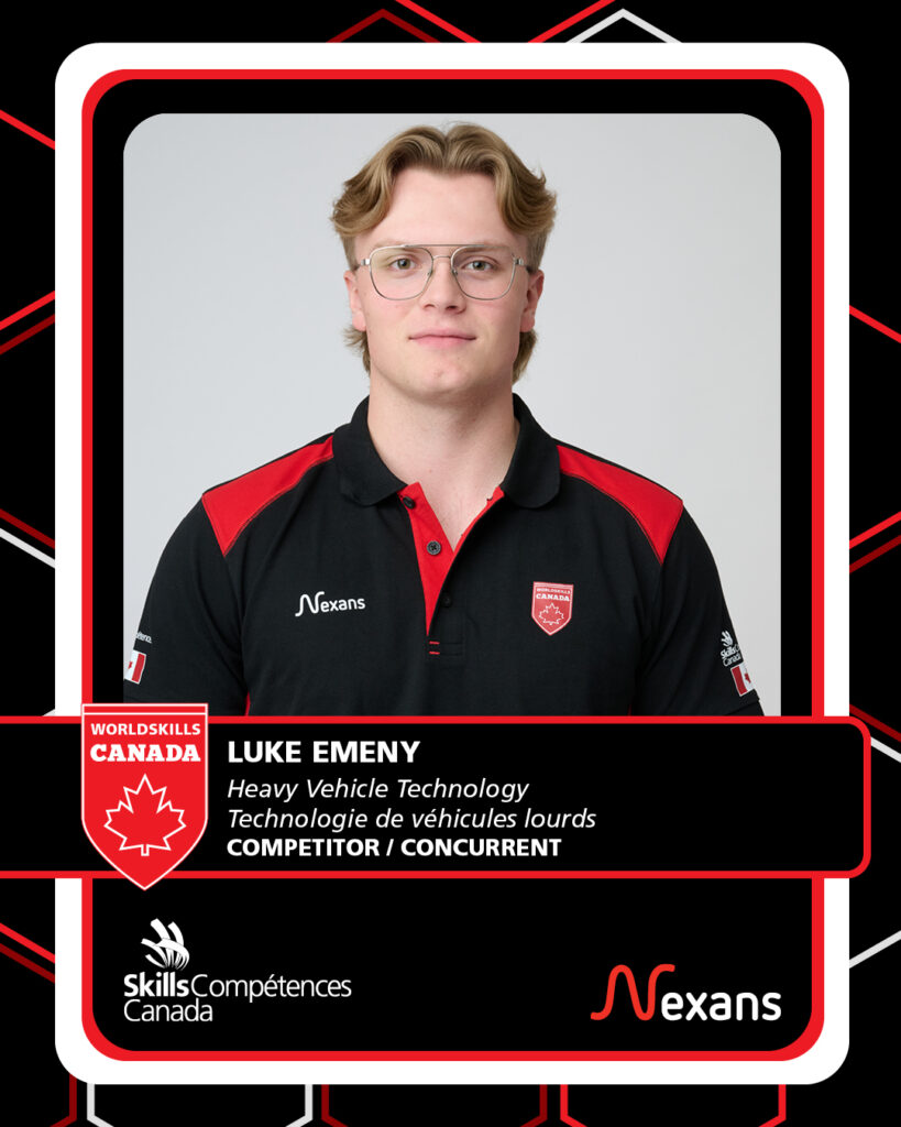 Luke Emeny’s journey in Heavy Vehicle Technology has been driven by a desire to keep learning and take on new challenges. After gaining valuable experience through Skills competitions, his performance at the national level helped prepare him for the next step on the international stage. What began as a leap outside his comfort zone has grown into an opportunity to represent Canada at WorldSkills Shanghai 2026. Through the experience, Luke has built strong connections, developed his skills, and is excited to meet competitors from around the world while continuing to push himself to grow in the trade.